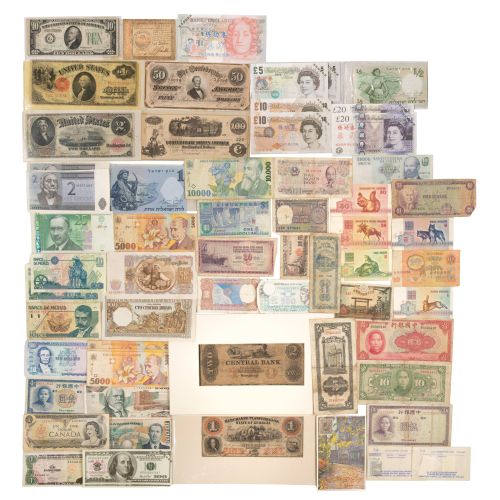 Including a 1779 $50 Continental currency note, a 1917 $2 legal tender, a 1917 $1 Washington, 1934-A $10, a 1957-B $1 silver certificate, C.S.A notes including an 1863 $100 and an 1864 $50, an 1853 $2 Central Bank of Alabama and a 1859 $1 Merchants Planters Bank State of Georgia and approximately (50) foreign bank notes from Hong Kong, China, Mexico, Japan, Romania and Serbia as well as assorted postage stamps, a Yugoslavian postcard and (2) US $100 novelty notes