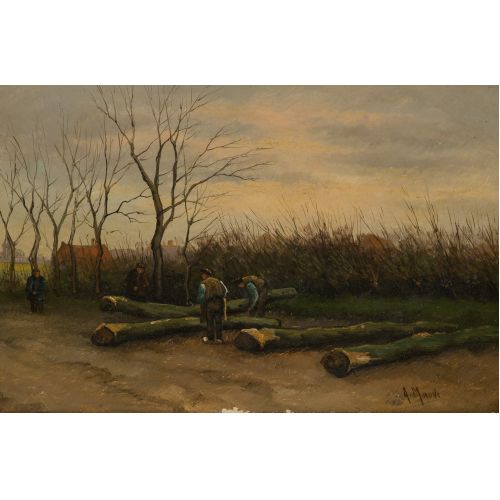 Undated, signed lower right, depicting lumber workers, on a beveled walnut panel having an Old Dutch Gallery, Amsterdam foil label verso, in a gold-tone gesso on wood frame