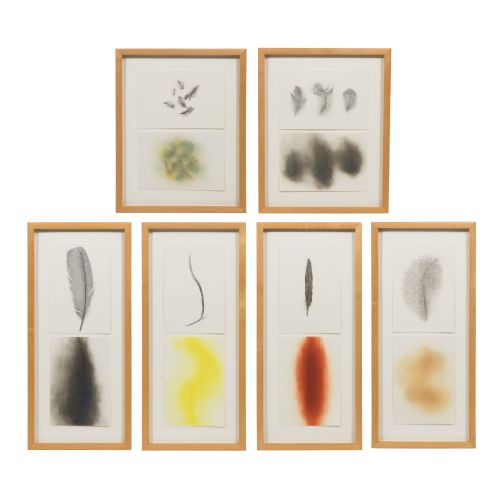 (6) items from the c.1995 series, undated, unsigned, soft ground aquatint etchings, each item having two prints on separate sheets float mounted together behind acrylic in a maple frame