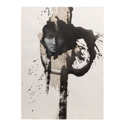 1990, ink signed and dated lower right, Utrecht paper blind stamp lower left, depicting a face emerging from sepia and black ink abstract work, unframed