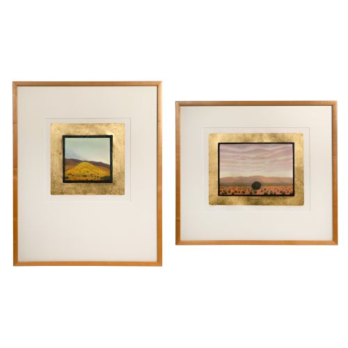 (2) items including 1991 "Red Hills", signed and P.P. 10/10 and 1989 "Hills" mono-type signed and P.P #1, both bordered by hand gilded gold leaf, matted under acrylic in wood frames