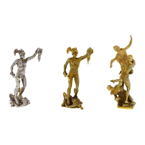 (3) items in miniature, all depicting Renaissance sculptures based on the works of Giambologna (two unmarked 14k gold, one unmarked 0.925 silver)