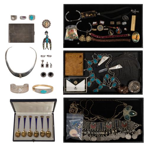 Including a Nicky Butler brooch, a bracelet and ring set, a choker, a ring, pendant and earring set, (2) pairs of earrings, a cigarette case, a hinged bangle and ring set, an enameled pin and a set of (6) demitasse spoons (some marked "sterling / 925"), some having stones as well as approximately (5) pounds of fashion jewelry including Indo-Persian style necklaces, Navajo style necklace, bracelets, cameo cufflinks, bangles, rings and Soviet enamel pins