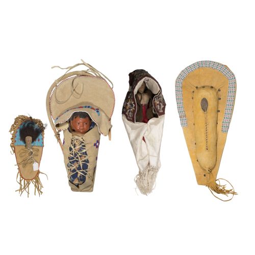 (4) model-size items including a Shoshone style hide-covered board edged in loom-woven beadwork at top and having a painted face fabric doll, a Lakota style fringed hide having beadwork and bead-faced leather doll, an Iroquois beaded tapestry decorated white fabric having copper pendant and painted face fabric doll and a Skookum style doll in a beaded-edged hide covered board
