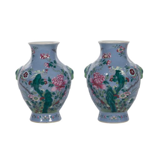 A pair of famille rose vases having molded ring style handles, a floral, aviary and butterfly motif on a claire de lune ground and underglaze blue Qianlong archaic seal stamps on undersides
