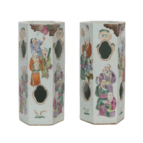 A pair of hexagonal pierced porcelain hat stands, Louhans (Buddhist Monks) in the famille rose colors and having red chop mark of Qing Dynasty Emperor, Tongzhi