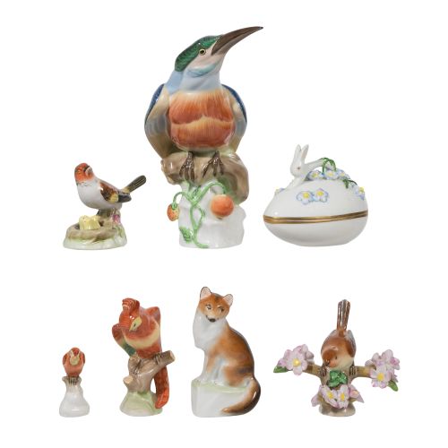 (7) items including a #5069 Kingfisher, a #6050 egg-shaped box having a bunny finial, a #5341 Fox, a #6005 Cockatoo as well as an indistinctly numbered bird and flowers, a bird and nesting chicks and a parrot, all having Herend marks underside