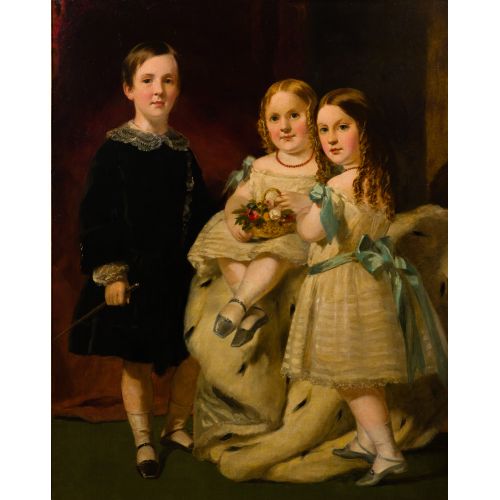 Undated, unsigned, portrait of three children, the central seated figure being ermine-robed, in a gold-tone gesso on carved wood frame, a 1973 invoice, photo and attribution card from Bonfee Interiors, Chicago tucked in verso