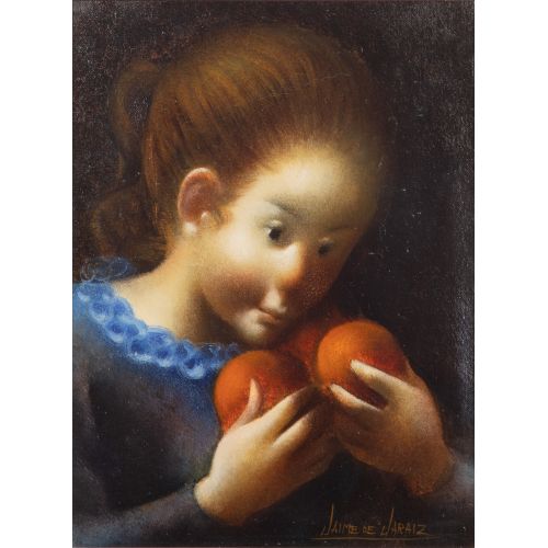 Undated, signed, depicting a girl holding fruit, in a gold-tone gesso wood frame, including an artist biograph booklet and bill of sale