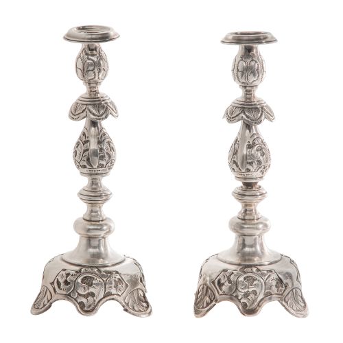 A hand-chased pair having scrollwork details (unknown assay mark, stamped "84")