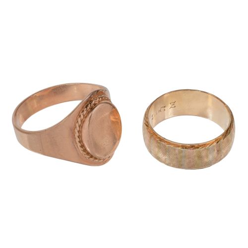 (2) items including a tri-color gold band and a rose gold signet style (marked "14k" / "583")