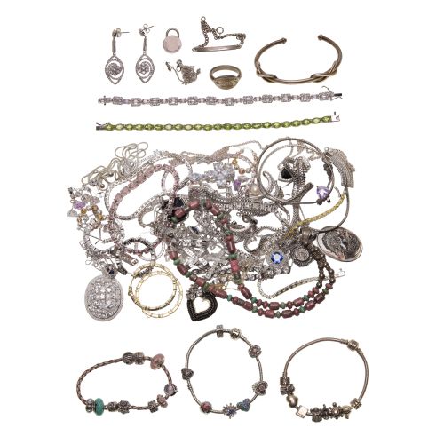 Including bracelets, necklace, and a ring (all marked "Tiffany & Co. 925") as well as bracelets (some Pandora), necklaces, earrings, pendants and charms, some having gemstones (marked "sterling" / "925", unmarked 0.830 silver)