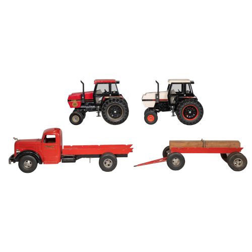 (3) items including a 1950s Smith-Miller pressed steel Mack lumber truck having tandem trailer and load as well as (2) 1/16 scale die cast Ertl Case IH 2594 tractors, #267 in red and #602TA in white, the white retaining a JICase Collector's Series sticker, both in original boxes