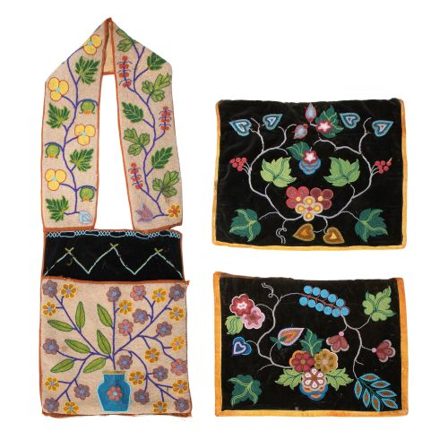 (3) items including an Iroquois beaded bandolier bag having floral on clear bead ground and (2) Ojibwe beaded dance aprons with floral designs on black velvet