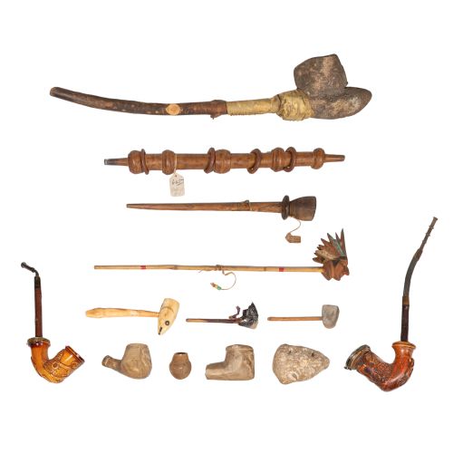 (15) items including a Pomo wood straight pipe having old tag reading "Humboldt Co., California", a Yupik walrus tusk fish form having inlaid eyes and otter stem, a massive whale bone bowl, rawhide wrapped to stem, a carved stone having stem, a carved limestone face bowl without stem, a pottery bowl and (2) carved Native American head having stems, some having Williams, Barker & Severn Co., Chicago auction tags; together with a ground stone axe head, a stone maul head, (2) carved clay bowls (one having American flag and eagle), (2) European style glazed ceramic and a turned wood stem having freed rings