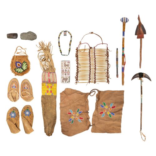 (13) total items including a Plains quill decorated pipe bag, a Plains bone bead breast plate, a regalia war club, (2) pairs of moccasins, a set of two dance aprons, a medicine pouch, a pipe stem, a loomed beadwork necklace and a wallet; together with a carved and painted avian form pipe, a horn headed regalia war club and a fragment of a hitched horsehair quirt