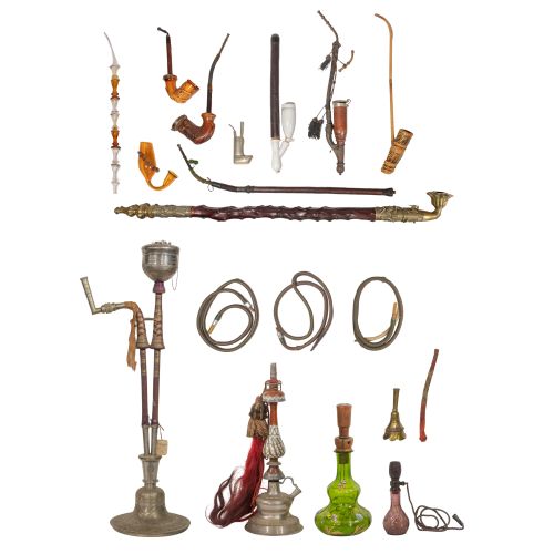 (12) items including (2) Indo-Persian engraved metal hookah bases, an enameled glass hookah base, an assortment of hoses, another small glass hookah base, a Chinese ornately cast brass and root wood opium pipe, a small metal opium pipe, (3) German style long pipes including a porcelain, a wood and a corncob, a glass pipe stem and a glass pipe
