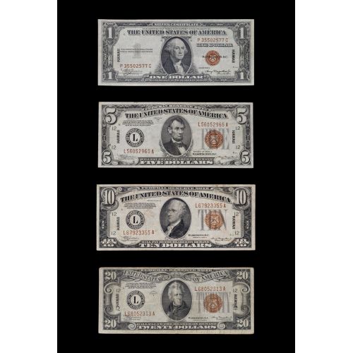 (4) items stamped "Hawaii" having red seals including a 1935-A $1 P35502577C, a 1934-A $5 L56052965A, a 1934-A $10 L67923355A and a 1934-A $20 L68052313A