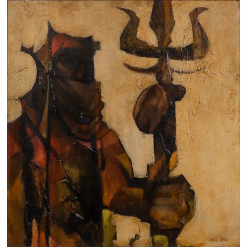 Undated, signed lower right, an impasto depiction of a dark figure holding a trident, matted in a linen liner within a painted wood frame