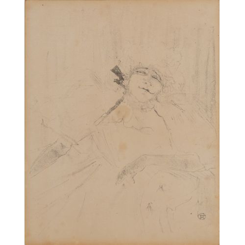 1898, having artist monogram, a view of the popular Parisian cabaret singer Yvette Guilbert in a chair from the Yvette Guilbert series, matted under glass in a wood frame