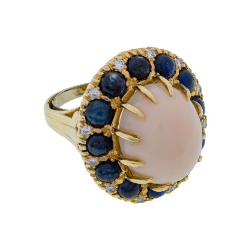 A cocktail dome style ring having an oval cut cabochon coral center stone (approximately 17mm x 14mm) encircled by round cut sapphires and accented in round cut diamonds (marked "14k")