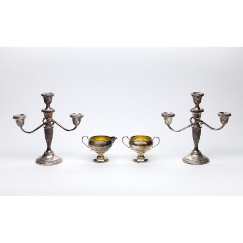 (4) items including Redlich cream and sugar bowl set and Crown weighted candelabra set (all marked "sterling")