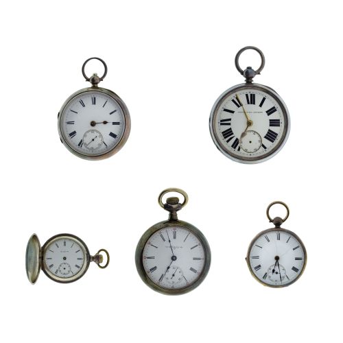 (5) items including an Elgin hunter case movement #15110984 dating to 1911, 15-jewel movement, size 0S, 354, 116, white dial having Roman numerals, seconds sub-dial, pendant wind, pendant set, a Hampden open face movement #29834 dating to 1877, size 18S, white dial having Roman numerals, gold-tone hands, seconds sub-dial, key wind, key set, an unknown maker open face case movement #80069, white dial having Roman numerals, black hands, seconds sub-dial, key wind, key set, a Milne open face case movement #4699 dating to c.1830, size 14S, white dial having Roman numerals, black hands, key wind, key set and an Elgin open face case movement #10820820 dating to 1905, size 18S, 288, white dial having Roman numerals, black hands, seconds sub-dial, pendant wind, pendant set (all marked "sterling" / "925" / lion passant)