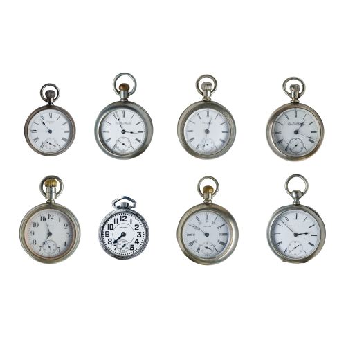 (8) items including and Elgin open face case movement #17868161 dating to 1914, 15-jewel movement, size 18S, 326, 106, white dial having Arabic numerals, blue hands, seconds sub-dial, pendant wind, lever set, American Waltham open face case movement #4921573 dating to 1891, size 14S, 1884, white dial having Roman numerals, blue hands, seconds sub-dial, pendant wind, pendant set, Waltham open face case movement #29261471 dating to 1937, size 16S, 1609, 1908, white dial having Arabic numerals, blue hands, seconds sub-dial, pendant wind, pendant set, Elgin open face case movement #779887 dating to 1881, size 18S, white dial having Arabic numerals, blue hands, key wind, key set, Elgin open face case movement #5058854 dating to 1894, 15-jewel movement, size 18S, 77, white dial having Roman numerals, blue hands, seconds sub-dial, pendant wind, pendant set, Elgin open face case movement #10477487 dating to 1904, size 18S, 208, 63, white dial having Arabic numerals, blue hands, seconds sub-dial, pendant wind, pendant set, Waltham open face case movement #17989837 dating to 1910, 15-jewel movement, size 18S, 81, 1883, white dial having Roman numerals, blue hands, seconds sub-dial, pendant wind, pendant set, Elgin open face case movement #4142514 dating to 1891, size 18S, 73, 11, white dial having Roman numerals, blue hands, seconds sub-dial, pendant wind, pendant set