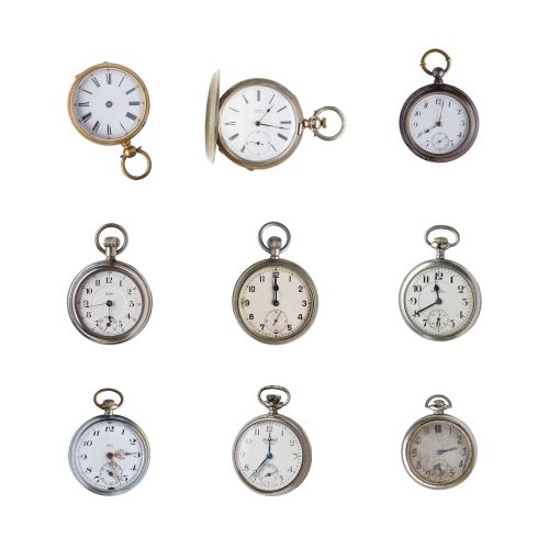 (9) items including a Buchan open face case movement #644 size 12S, white dial having Roman numerals, key wind, lever set, a Sugasti hunter case size 18S, white dial having Roman numerals, black hands, seconds sub-dial, key wind, key set, a Buren Watch Co open face case size 12S, silver dial having Roman numerals, blue hands, seconds sub-dial, pendant wind, pendant set, an Ingersall open face case movement #71596069 size 18S, white dial having Roman numerals, blue hands, seconds sub-dial, pendant wind, pendant set, a Golays, Fills and Stahl dating to 1908, size 10S, white dial having Arabic numerals, black hands, seconds sub-dial, key wind, key set, a Swiss Made open face case 15-jewel movement, size 16S, white dial having Arabic numerals, blue hands, seconds sub-dial, pendant wind, pendant set, a Cook open face case size 12S, white dial having Arabic numerals, blue hands, seconds sub-dial, pendant wind, pendant set, a Hamilton open face case movement #2538218 dating to 1929, 17-jewel movement, size 16S, 974, white dial having Arabic numerals, black hands, seconds sub-dial, pendant wind, lever set and an EOS open face case size 14S, white dial having Arabic numerals, gold-tone hands, seconds sub-dial, pendant wind, pendant set
