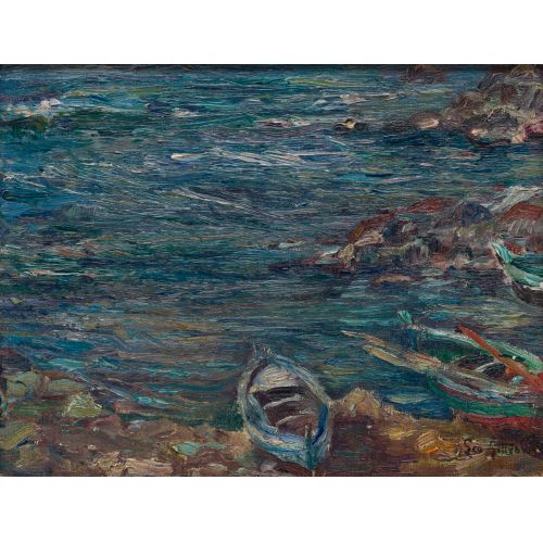 Undated, signed lower right, depicting a rocky seashore and boats, in a wood frame