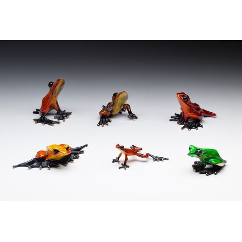 (6) enameled frogs in various colors, sizes and poses, all having cast "Frogman" mark and signed underside