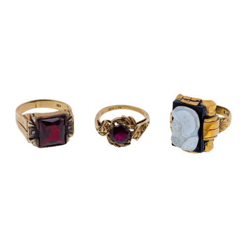 (3) items including a carved onyx (marked "10k") and (2) garnet (unmarked 9k)