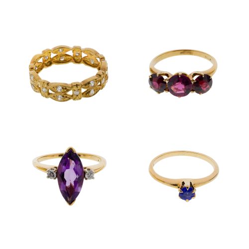(4) items including an amethyst, a garnet, a tourmaline and a diamond accented band (most marked "14k")