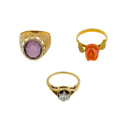 (3) items including a round cut diamond solitaire, a coral rose and an amethyst (marked "18k" / "750")