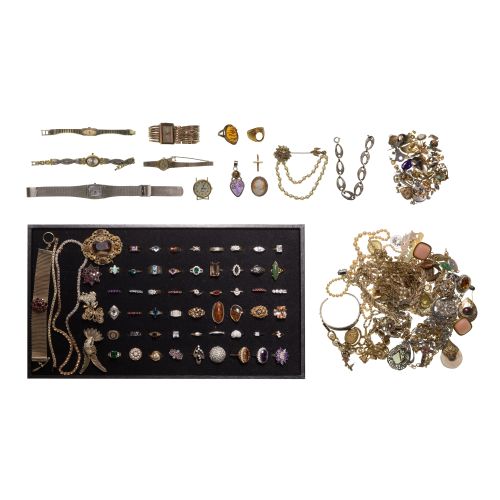 Including a starburst design cross and a ring setting (marked "18k"), a tigers eye / purple stone pendant and an amber ring (marked "875" silver), a cameo pin and a modernist design bracelet (marked "800" silver), a marked Miriam Haskell gold-tone metal and simulated pearl cloak pin and approximately (3) pounds of costume jewelry necklaces, pendants, bracelets, pins, rings, earrings and wristwatches