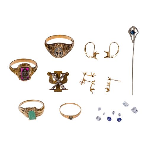 (10) total items including (2) class rings, a semi-precious green gemstone ring, a baby ring, a fraternal pin, an Art Deco style white gold stick pin and yellow gold earring settings (all marked "10K"); together with loose cubic zirconia gemstones