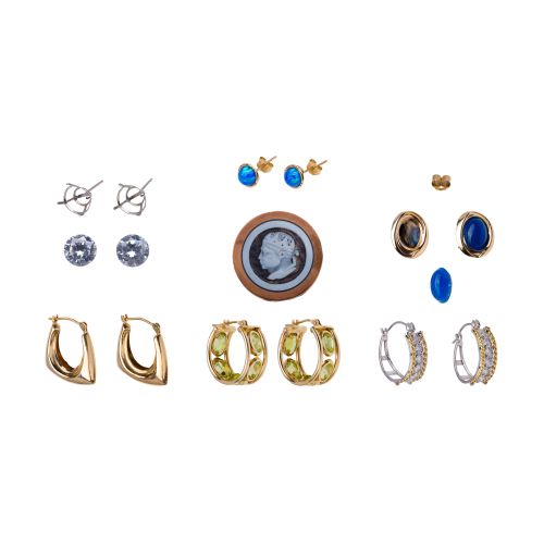 (8) total items including (5) pairs of pierced earrings, a pair of basket settings, a carved locket and a backer (most marked "14k")