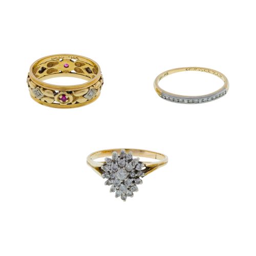 (3) items including a TruGlo diamond accented dome style, a band having inset diamond and ruby accents and a diamond accented band (marked "14k")