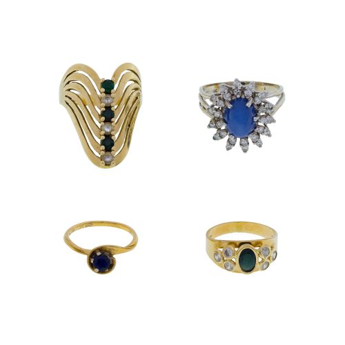 (4) items including a V-shaped emerald and diamond modern cocktail ring, a solitaire sapphire, an oval cut sapphire in a bezel setting flanked by diamond accents and an oval cut star sapphire surrounded by round cut diamond accents (most marked "14k")
