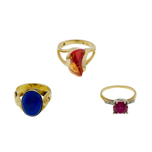 (3) items including an oval cut lapis lazuli, a Modernist style orange gemstone and a round cut ruby (most marked "14k")