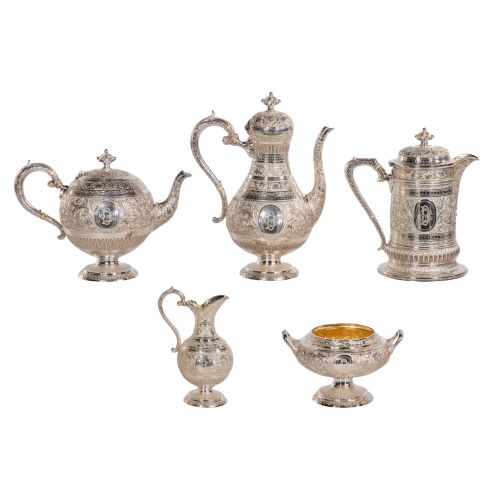 (5) items dated 1879 to 1881, including a coffee pot, teapot and a water pitcher, sugar bowl and creamer having gold-wash interior, all having ornate Victorian-era engraving, embossed panels, swirl designs, personalized monograms "CB", all in a custom fitted velvet-lined wood case stamped "William Marshal, Edinburgh" (all hallmarked, dated and having a lion passant)