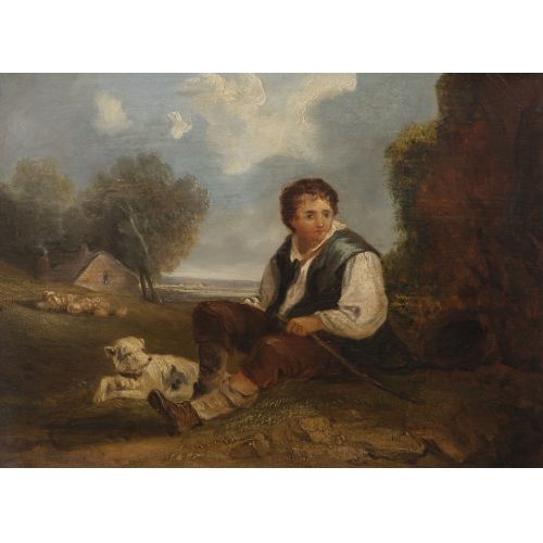 Undated, illegibly signed, depicting a young boy sitting in a pastoral landscape alongside his dog, in a painted gold-tone frame