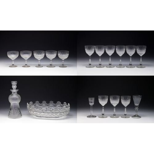 (18) total items, mostly unmarked, including a Waterford Kennedy bowl, a decanter in the Edinburgh Crystal Thistle pattern, (3) champagne coupes and (9) wine glasses in the Edinburgh Crystal Marlboro pattern, an etched crystal wine glass and an etched crystal cordial, both 18th century British style; together with (2) pressed glass champagne coupes