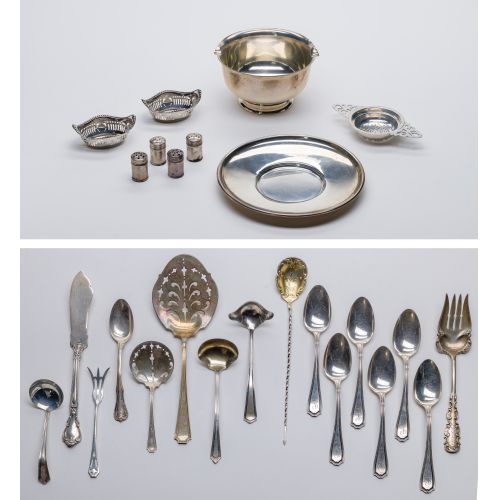 (25) items including a sauce bowl and saucer, a tea strainer, spoons, a butter knife, forks and salt and pepper shakers (all marked "sterling" / "925")
