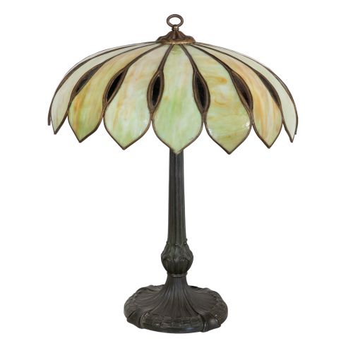 Having cream and green sixteen-panel glass shade in the form of lotus petals on a metal base
