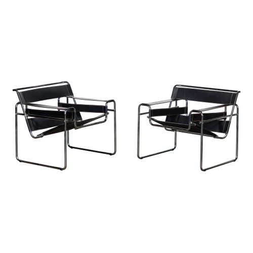 A pair of modernist armchairs having a tubular steel frame and black leather for the seat and back, unmarked