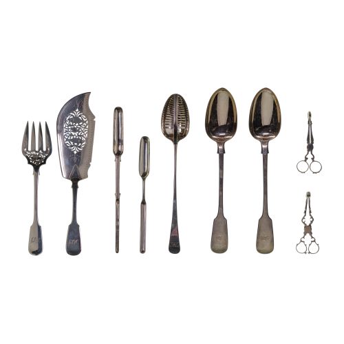(9) items including a gravy strainer, (2) pairs of sugar tongs, (2) marrow scoops, (2) serving spoons, a serving fork and a fish server (all marked lion passant)