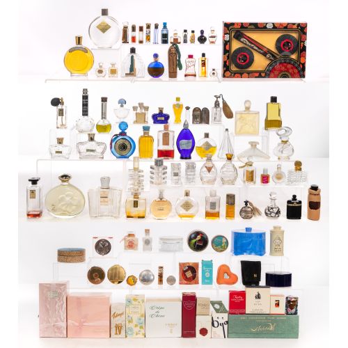 Approximately (75) items of various shapes, contents, scents, designs, makers including Schiaparelli, Chanel, Nina Ricci, Lucien LeLan, Salvador Dali, Hattie Carnegie, some retaining liquid, some having original boxes, some appearing unopened