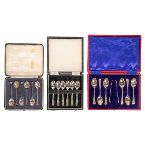 (3) cased sets of demitasse spoons including a set of (6) Elkington & Co., a set of (6) William Hunt and a set of (6) John Round having sugar tongs (all having lion passant)
