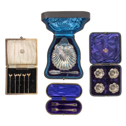 (4) items including a cased butter dish and knife by James Deakin and Sons, a cased set of (2) cocktail forks, a cased set of (4) salt cellars and a cased set of (5) tooth picks (all having lion passant or marked "sterling")